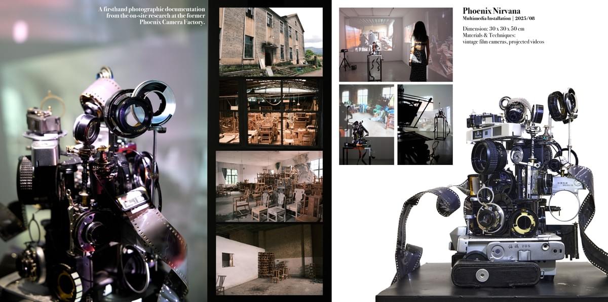 Phoenix Nirvana references both the camera brand my grandparents built and the cycle of death and rebirth—transformation through loss. The piece invites viewers to pause and reconsider our relationship with technology and time. In our hurried world, slowing down is itself a revolution—a return to warmth, presence, and deliberate creation.